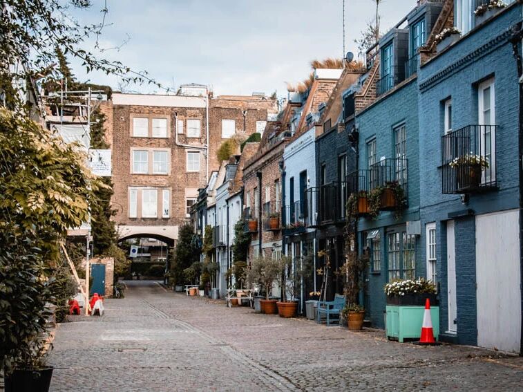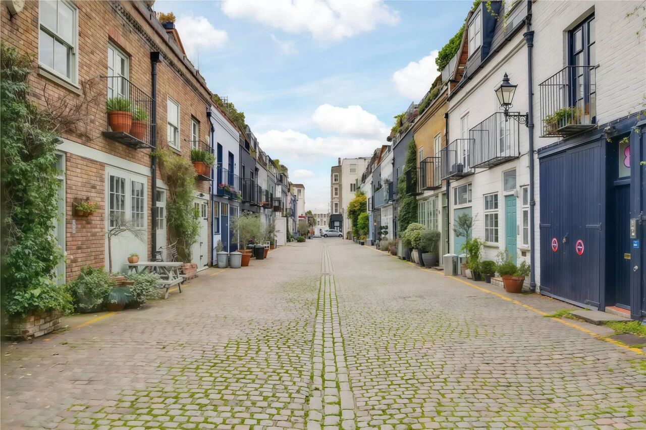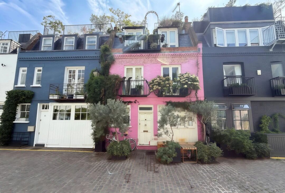 隐藏在诺丁山社区深处的圣卢克巷(St Luke’s Mews),是当下最受欢迎的电影打卡街道之一。这条安静的马厩街道,正是《真爱至上》中那对年轻情侣的居住地。粉色与浅色系外墙、整齐的车库门,让整条街极具摄影吸引力,也成为影迷心中最具“电影感”的现实场景之一。